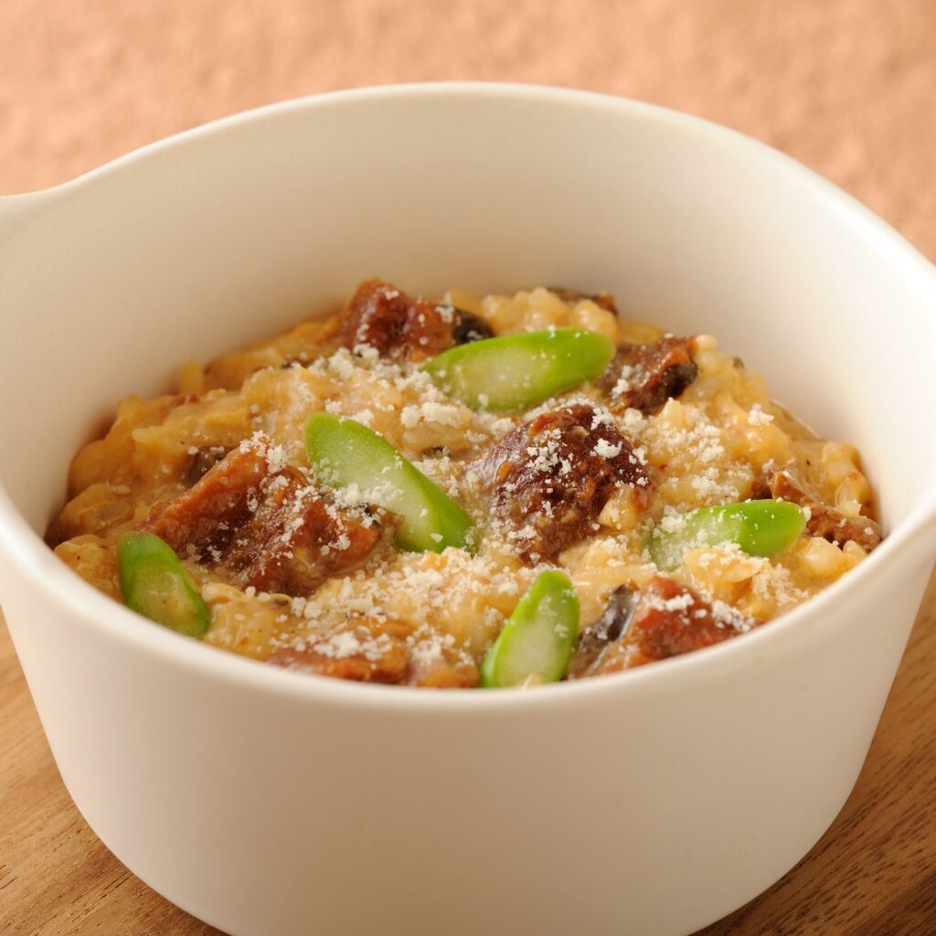 「鰻まぜごはんの素」を使い、お出汁で優しく炊き上げた和洋折衷のリゾットです。うなぎの芳醇な旨味が染み出したごはんを、とろとろの卵と粉チーズが包み込み、驚くほど濃厚でまろやかな味わいに。アスパラの食感が心地よいアクセントを添え、ひと口ごとに至福のコクが広がります。お出汁とチーズ、そしてうなぎの秘伝のタレが生み出す絶妙なハーモニーは、お子様から大人まで楽しめる贅沢な美味しさ。身も心も温まる一皿は、休日のランチや冷え込む夜のメインディッシュにも最適です。粉チーズをたっぷりかけて、とろけるような口当たりをご堪能ください。