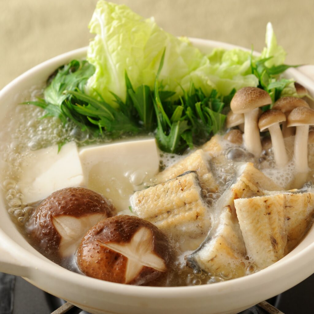 2.お鍋にだし汁とお好みの野菜を入れ、火がとおる頃にうなぎ白焼を入れる。