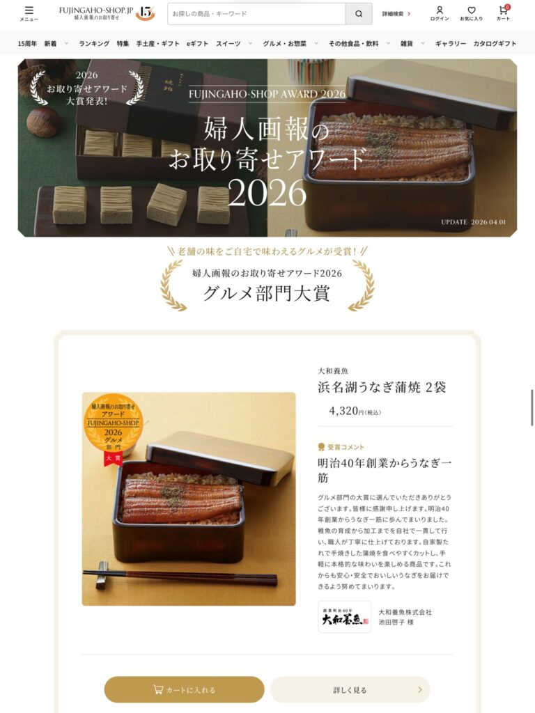 このたび、弊社大和養魚株式会社(以下、大和養魚)の「浜名湖うなぎ蒲焼」が、「婦人画報のお取り寄せアワード2026」において、激戦のグルメ部門大賞を受賞しました。